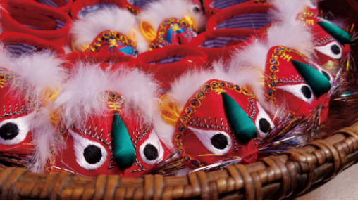 在端午节俗中,公鸡也被人们认为是可以灭除五毒的,因此也常作为端午服饰上使用的纹样题材。为了驱邪避凶,端午节还有若干守护神,如张天师、钟馗、关帝等,他们的形象也会出现在民间的节令服饰上。