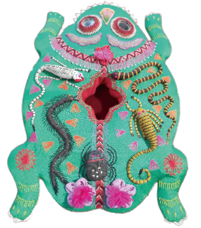 既然是端午节令服,衣料上多织绣出各种应景纹样,最主要的题材是艾虎、五毒,此外还有天师、金鸡、五瑞、龙舟等系列图案,寓意驱邪避害,以辟瘟气。五毒一般指蛇、蝎、壁虎、蜈蚣、蟾蜍,通常还配合老虎、艾草等象征可灭除毒虫的纹样,并称为艾虎五毒。