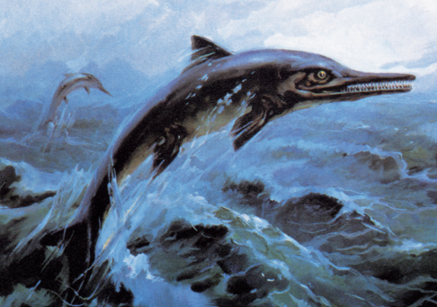 中生代时,恐龙统治了陆地。但有一些爬行动物生活在海里,它们有一个共同的名字叫“海洋爬行动物”,又被称为“中生代的海怪”。比如大家熟悉的鱼龙、蛇颈龙和沧龙,以及不太熟悉的楯齿龙、海龙等。它们的名字里大都有一个“龙”字,但都不是恐龙。虽然有个别恐龙可以在水中游泳捕食(比如棘龙),但恐龙主要生活在陆地上;还有一些恐龙能飞上蓝天,比如小盗龙、近鸟龙、足羽龙等。恐龙与“海怪”们的联系是,它们同属于双孔类爬行动物,只不过这个亲缘关系不如翼龙和恐龙的亲缘关系近,更不如鸟类和恐龙的亲缘关系近。