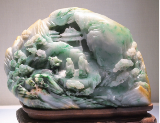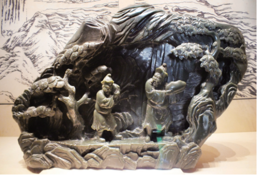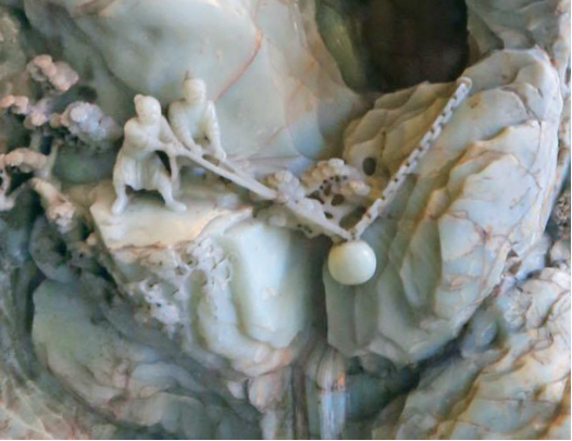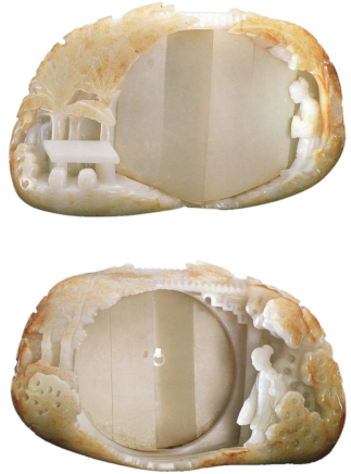 不过,玉山子并不是将山水画进行简单的“立体化”;相比之下,它更注重表现山石、建筑、植物和人物的细节特征。由于受玉料本身的限制,玉山子无法过多渲染色彩,故而以山水空间层次和人物形态描绘作为创作的重点。