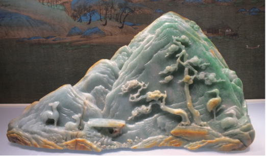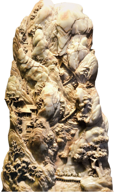 所谓山子,其实是一种常见的石雕摆件,大多陈设在书房或卧室,因为它表现的主要是山水田园风光,仿佛一座微缩假山,故而得名。山子有大有小,大的甚至可重达数吨,山子所用石料种类繁多,如钟乳石、太湖石、灵璧石、汉白玉等;小的则可以手持把玩,一般为名贵玉石,如和田玉、翡翠、青金石等,其中以和田玉为首选。