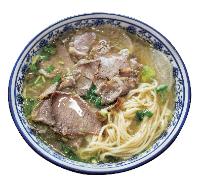 不过,这只完成了第一步。第二步是把熬好的头道汤放进陶缸冷却,待次日天明开业时,取出部分浓汤再兑入一定比例的开水再熬一次。这时候,清亮澄澈、鲜美浓郁的牛肉汤就呈现在眼前了。但到此依然不能算大功告成,因为牛肉面的辅料也是调汤的一个重要组成部分。最主要的辅料就是萝卜,要切成长形或扇形的片,放入开水锅中焯一下,然后捞出浸漂冷水,再倒入汤里煮,这样既可以让萝卜软硬适口,又可以去掉萝卜特有的异味。