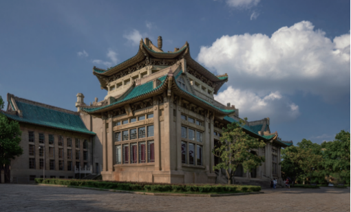 在武汉大学的众多建筑中,位于狮子山的武汉大学图书馆格外醒目。它不仅是武汉大学的地标建筑,同时也入选为武汉市十大地标建筑之一,更是武汉大学的精神象征。图书馆背对东湖,南向珞珈山。图书馆的东、西两翼为文学院、法学院,相对矗立,堪称一对姊妹楼。文学院屋顶采用翘角,寓意文采飞扬;法学院四角飞檐平缓,显得端庄稳重,寓意法理正直、执法如山。俯瞰图书馆,大楼整体外观为中国传统殿堂式,主楼顶部为八角歇山顶,周围附楼为歇山顶,外部装饰极具中国传统特色,完整展现了中国宫殿式建筑的威武庄严。