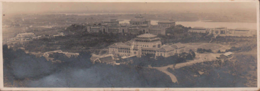 如果仔细查看武汉大学校园鸟瞰图,可以发现置于建筑群中间的是狮子山建筑群,两侧半包围的建筑屹立至今。最左侧包围的建筑是老外文楼,最右侧包围的建筑是数学与统计学院。前面的建筑从左到右依次是学生宿舍和宇字斋、地字斋等,整个建筑群的布局,主要参照中式轴对称形制分列。学校整体规划依山就势,以狮子山图书馆为整个校园的制高点,将各个学院、工厂、宿舍以及农场等建筑物,依照各自的性质、功能以及武汉的风向气候等,采取“三点、放射状”布局。校园建筑将中国传统建筑文化与西方古典建筑特征有机融合,运用新材料、新技术、新形式最后设计出了融贯东西、中西合璧的武汉大学早期建筑。