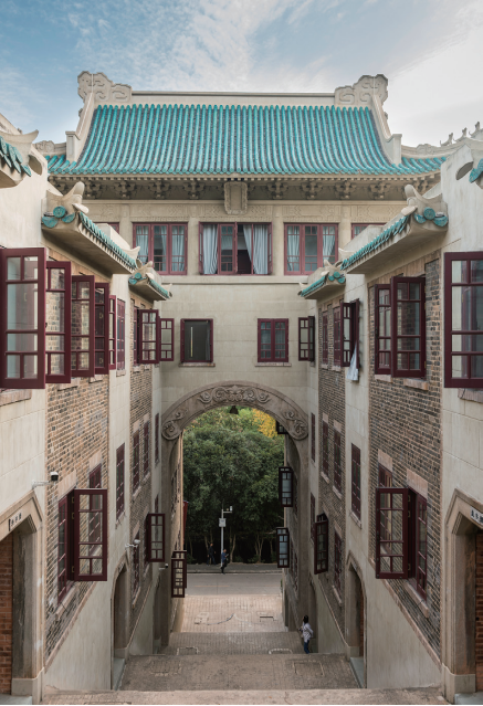 老斋舍是武汉大学最早的学生宿舍,如今依旧作为学生宿舍在使用。老斋舍建于1930年,从这里走出了74位两院院士。整栋建筑与狮子山连在了一起,建筑师顺应山体的自然地势变化巧妙地进行设计建造。建筑的东西方向有50个开间,总长近200米,沿山坡等高线建造了不同楼层的建筑,共有三排,一排比一排高,形成了高低错落的两重内天井的院子。如果从远处眺望老斋舍,确实颇有一点布达拉宫的气势。老斋舍最有趣味的是斋名,是按照“天地玄黄、宇宙洪荒、日月盈久、辰宿列张”的序列来为16个宿舍门洞命名的,如“天斋室”“地斋室”等。