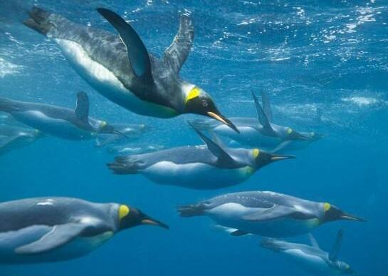 企鹅虽然走路一摇一晃,跑动起来连滚带爬,但在水中它的速度可达25~30千米/小时,一天游上160千米也非常正常,可以说水下就是企鹅的天空,它们的“飞翔”是在水中进行的,那一双小翅膀就是为了在水下潜泳而特别准备的。