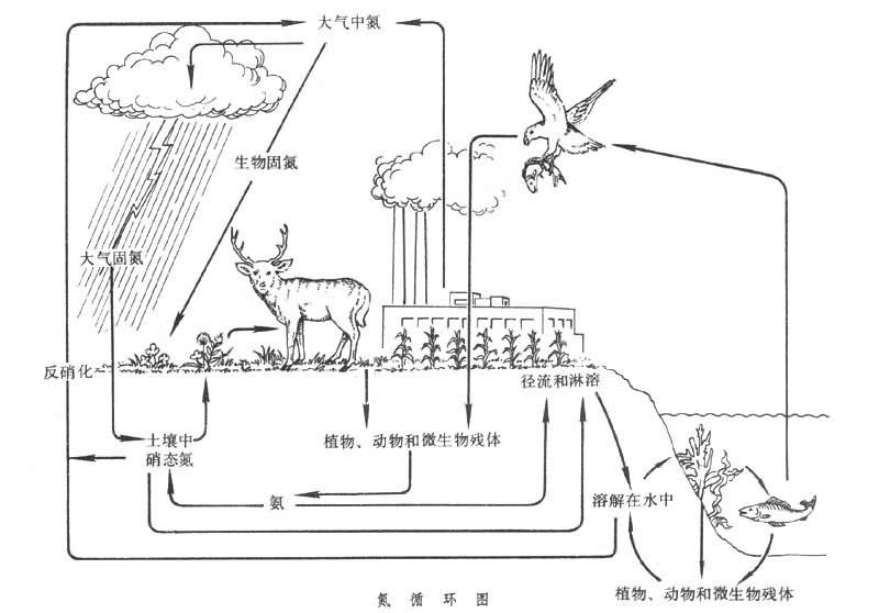 氮地球化学循环活动主要在大气圈、海洋和海、陆生物圈之间进行。氮循环可以分为下列各阶段:氮的固定是使氮转化为无机氮化物的过程,是由某些细菌和蓝绿藻完成的,少量氮是由闪电、紫外辐射以及人工合成氨工业固定的;氮固定生成的氨和硝酸盐被水藻和植物吸收,同化为特殊的组织化合物,随后被动物食用,转化成体内的物质;所有生物体及排泄物又被微生物分解为氨和硝酸盐,又再参与植物和动物体内的同化、吸收、氨化—硝化的循环过程。